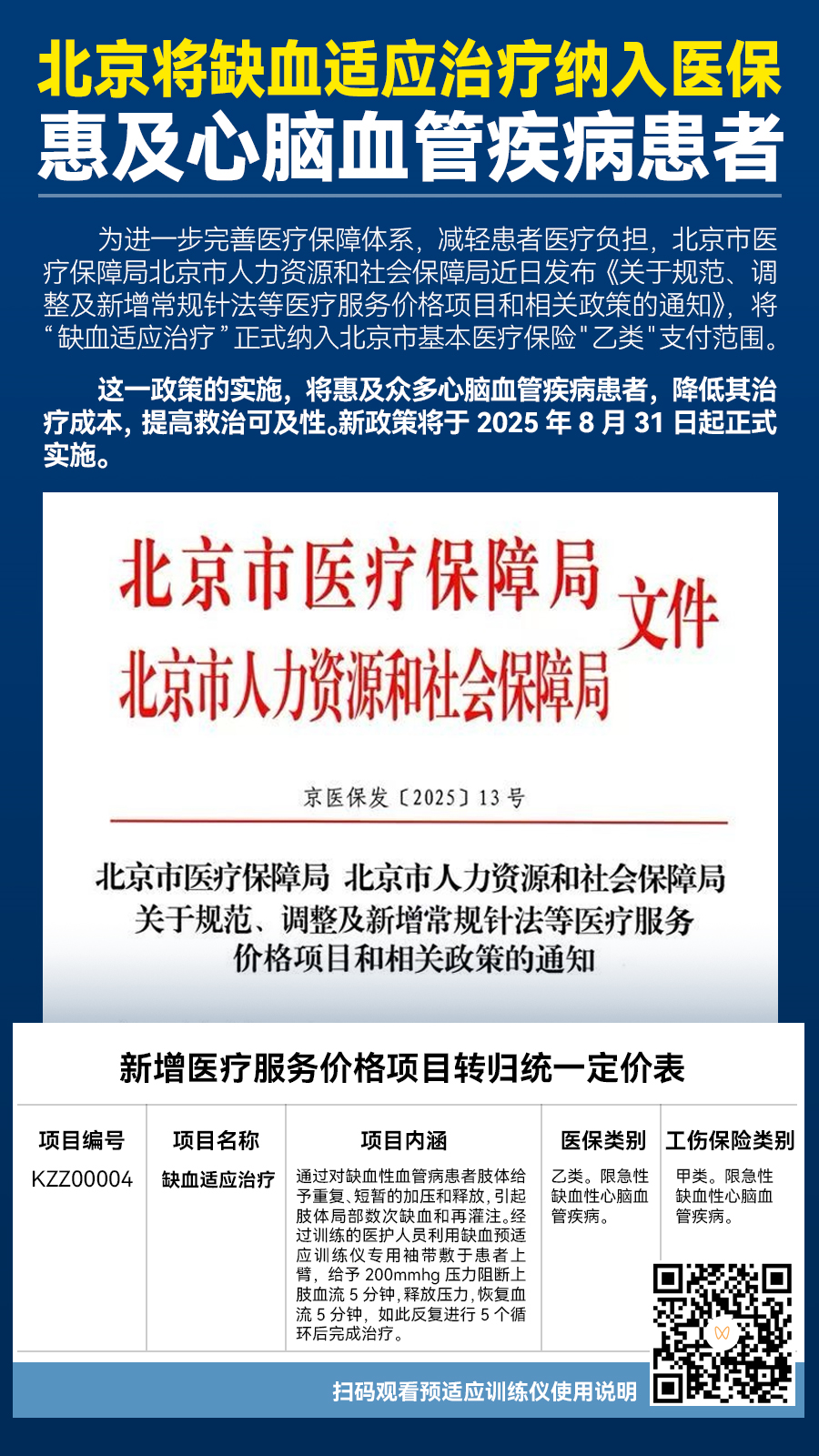 為進一步完善醫(yī)療保障體系,減輕患者醫(yī)療負擔,北京市醫(yī)療保障局北京市人力資源和社會保障局近日發(fā)布《關于規(guī)范、調整及新增常規(guī)針法等醫(yī)療服務價格項目和相關政策的通知》,將“缺血適應治療”正式納入北京市基本醫(yī)療保險"乙類"支付范圍。
